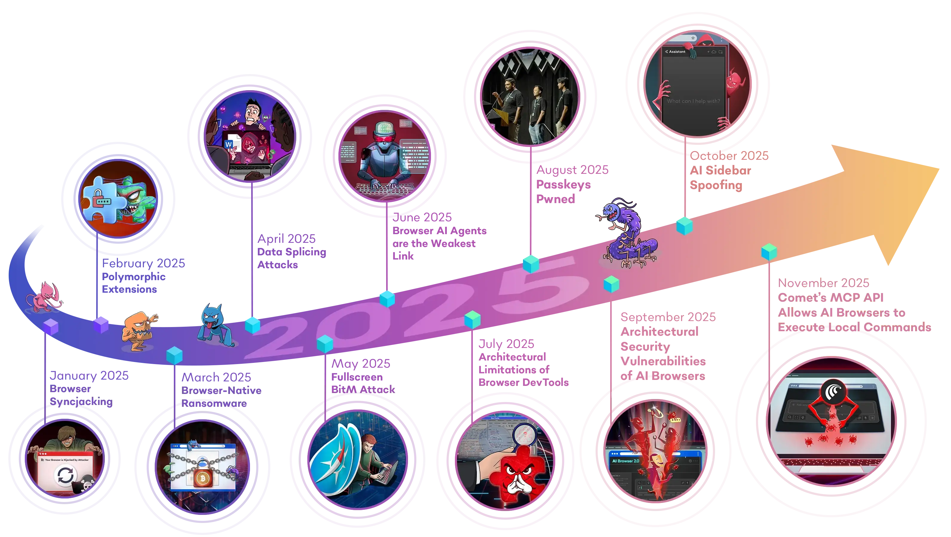 In the beginning of this year, we launched the Year of Browser Bugs (YOBB) project, a commitment to research and share critical architectural vulnerabilities in the browser. Inspired by the iconic Months of Bugs tradition in the 2000s, YOBB was started with a similar purpose - to drive awareness and discussion around key security gaps and emerging threats in the browser. Over the past decade, the browser has become the new endpoint, the primary through which employees access SaaS apps, interact with sensitive data, and use the internet. The modern browser has also evolved significantly, with many capabilities that support complex web apps that parallel the performance of native apps. As with all new technologies, the very same features are also being used by malicious actors to exploit users, exploiting a massive security gap left by traditional solutions that primarily focus on endpoints and networks. Compounded with the release of AI Browsers, the browser has become the single most common initial access point for attackers. Yet, it remains to be poorly understood.